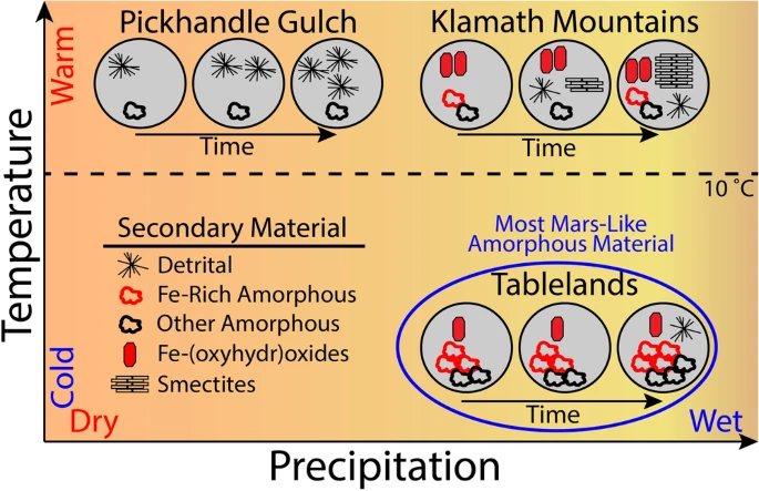 Anthony Feldman, scienziato del suolo e geomorfologo al Desert Research Institute (DRI), spiega che i materiali amorfi ai raggi X sono come “una zuppa di diversi elementi e sostanze chimiche che scivolano l’una sull’altra”. L’analisi chimica dei campioni del cratere Gale ha rivelato che questi materiali sono ricchi di ferro e silicio, ma poveri di alluminio, suggerendo condizioni ambientali particolari durante la loro formazione.